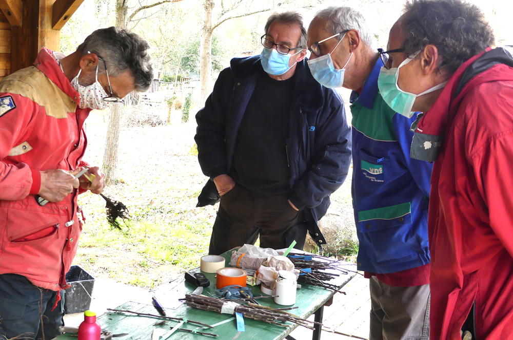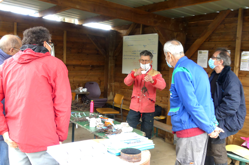 Ainsi Bernard, Bruno, Christian, Jean-Claude, Jean-Luc et René masqués, assistaient à la présentation théorique, interactive et surtout pratique de la greffe à l’anglaise compliquée.