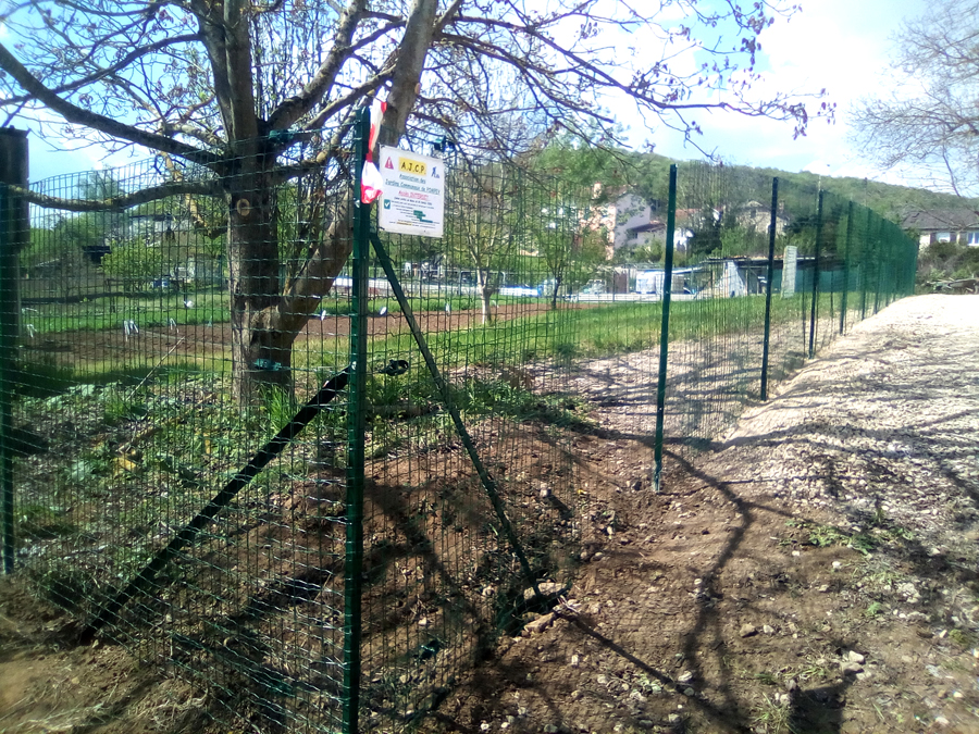 En avril 2021 c’est la pose d’une clôture de 40 m en bordure du parking des jardins sud, coté magasin ALDI qui vient d’être réalisée. Un portail piéton de 2m a été mis en place en novembre et un projet de portail barrant la piste le long de la SNCF est à l’étude. Des panneaux d’affichage informent les visiteurs de la réglementation et donc de l’accès limité aux seuls jardiniers et riverains. Il était important de la mettre en place à cet endroit stratégique où beaucoup de monde passe !