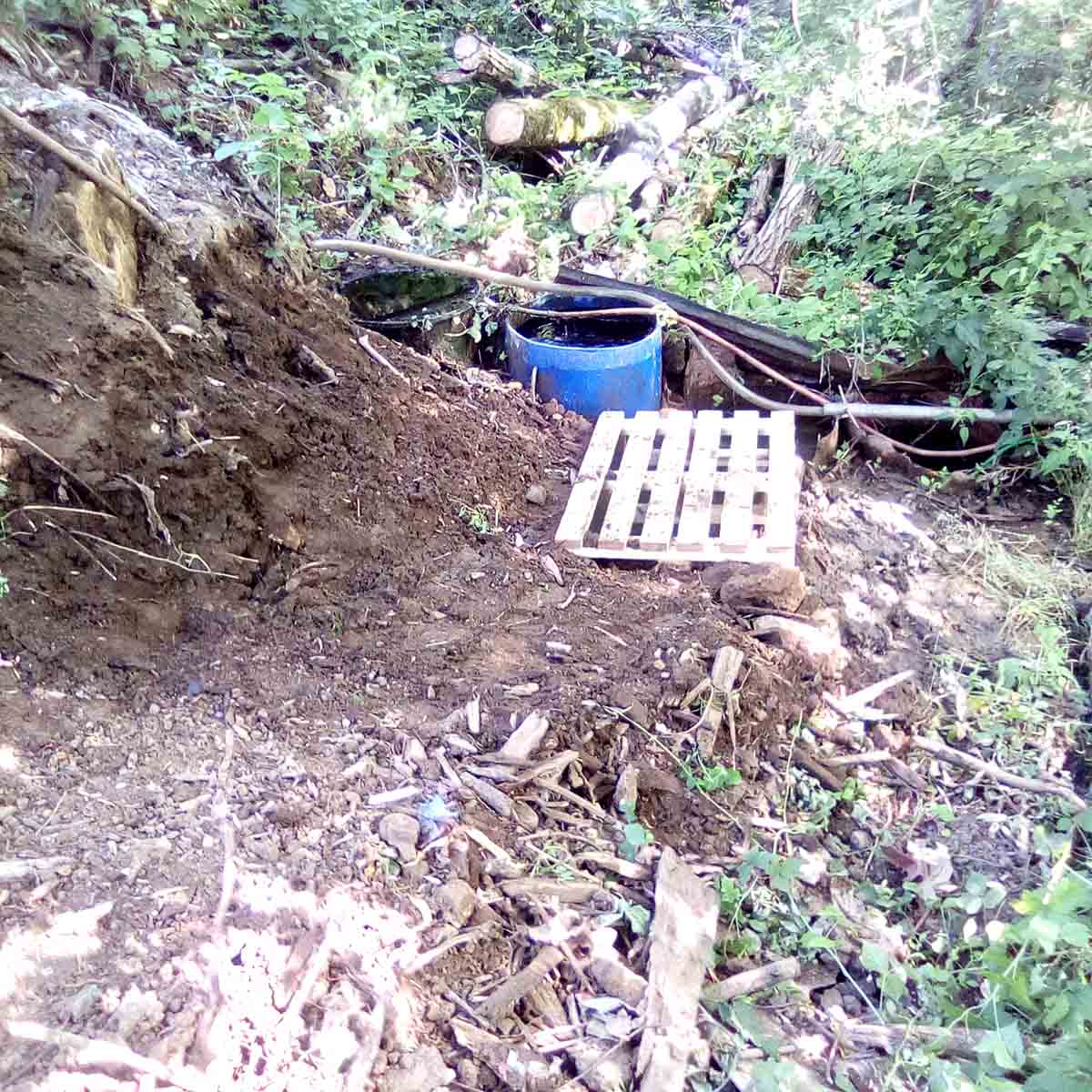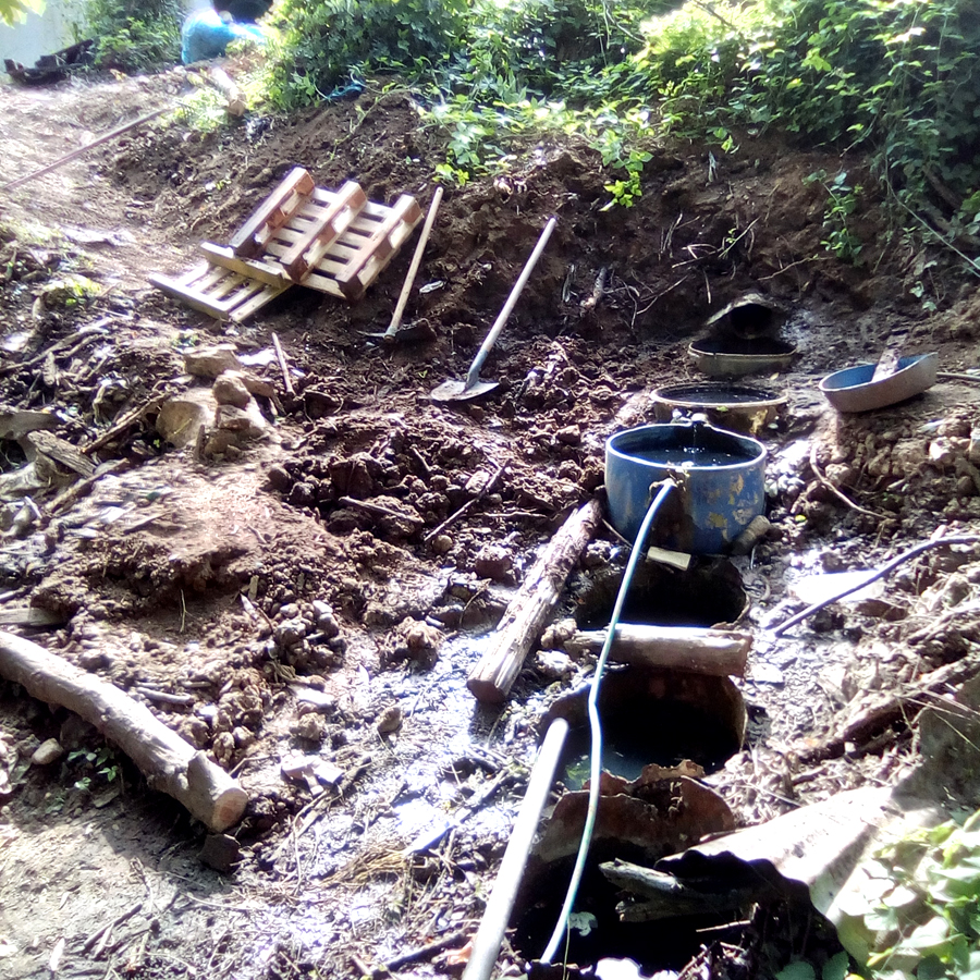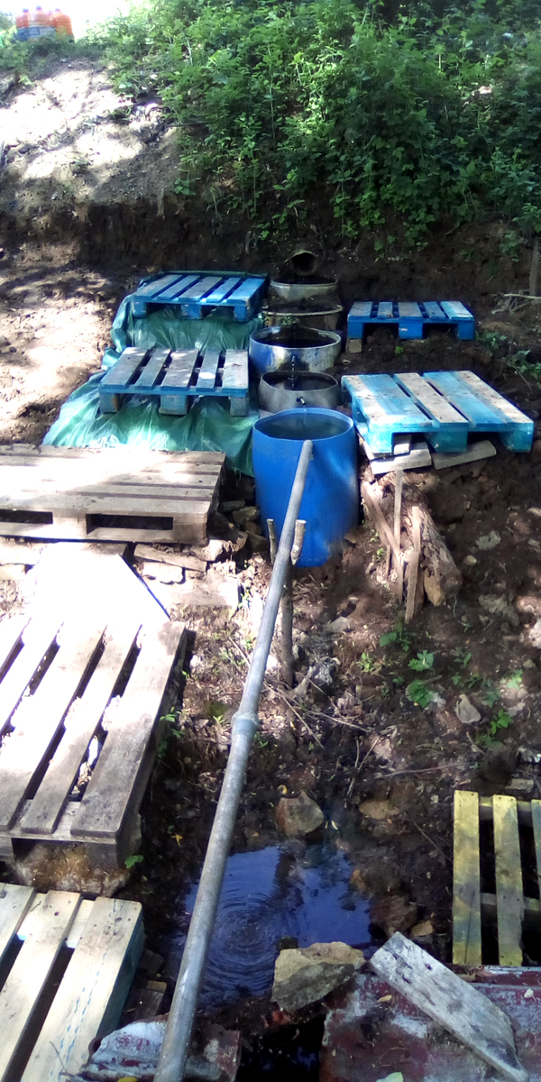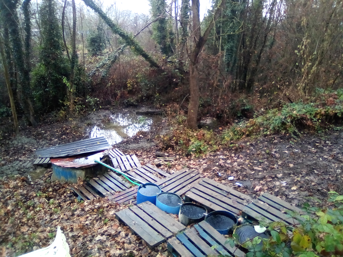 Il a donc fallu nettoyer l’espace de la végétation, mais surtout des détritus de tous ordres, dégager la terre qui avait recouvert entièrement les premiers bidons, retravailler la pente d’accès et les bidons en place. Les vieux bidons en acier rouillés ont été évacués et de nouveaux en plastique ont été implanté. Finalement un plancher en palettes a été disposé facilitant l’accès à l’eau, si utile en ces temps imprévisibles. A noter que cette source coule toute l’année, et ne s’est pas arrêtée lors des différentes périodes de sécheresse de ces dernières années.