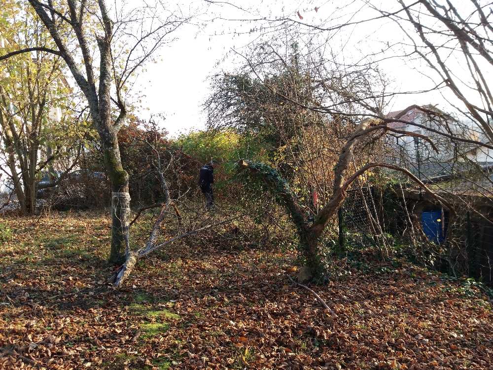 Une intervention en octobre 2019 pour éclaircir les noisetiers qui transforment le verger-jardin en futaie !!