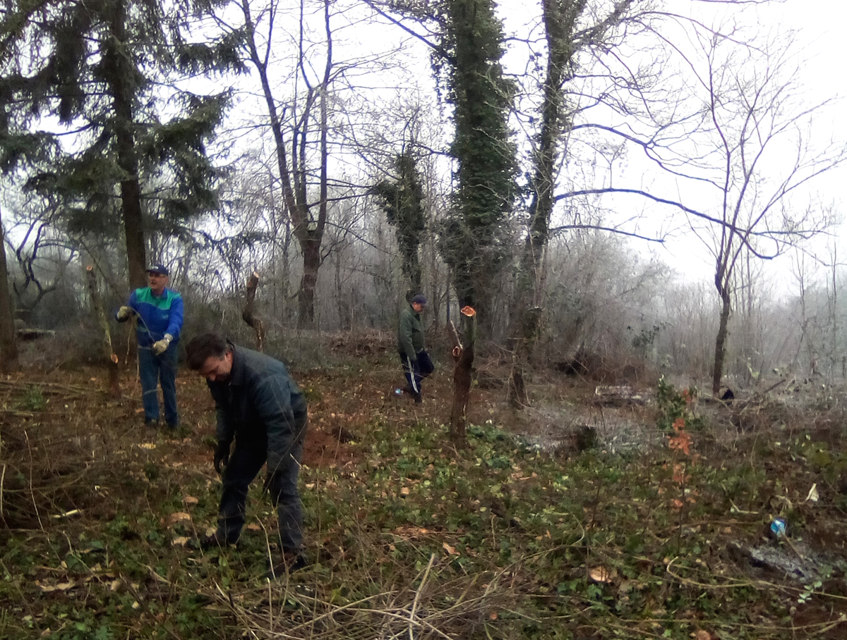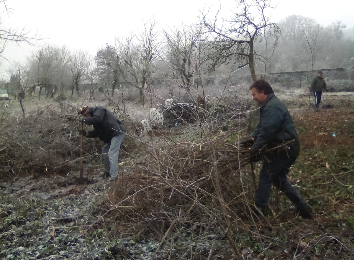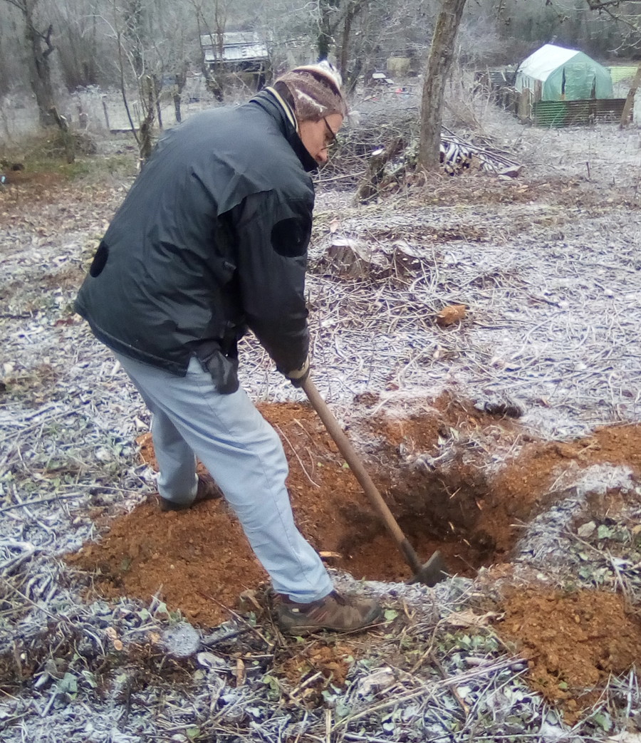 En décembre 2020, les 12 pommiers plantés en février dernier se portent bien. Le verger est régulièrement entretenu : 3 fauchages, binage autour des arbustes, apport de BRF et fumier décomposé d’âne (Ceux de l’Avant Garde). Un espace compost a été ajouté au verger.