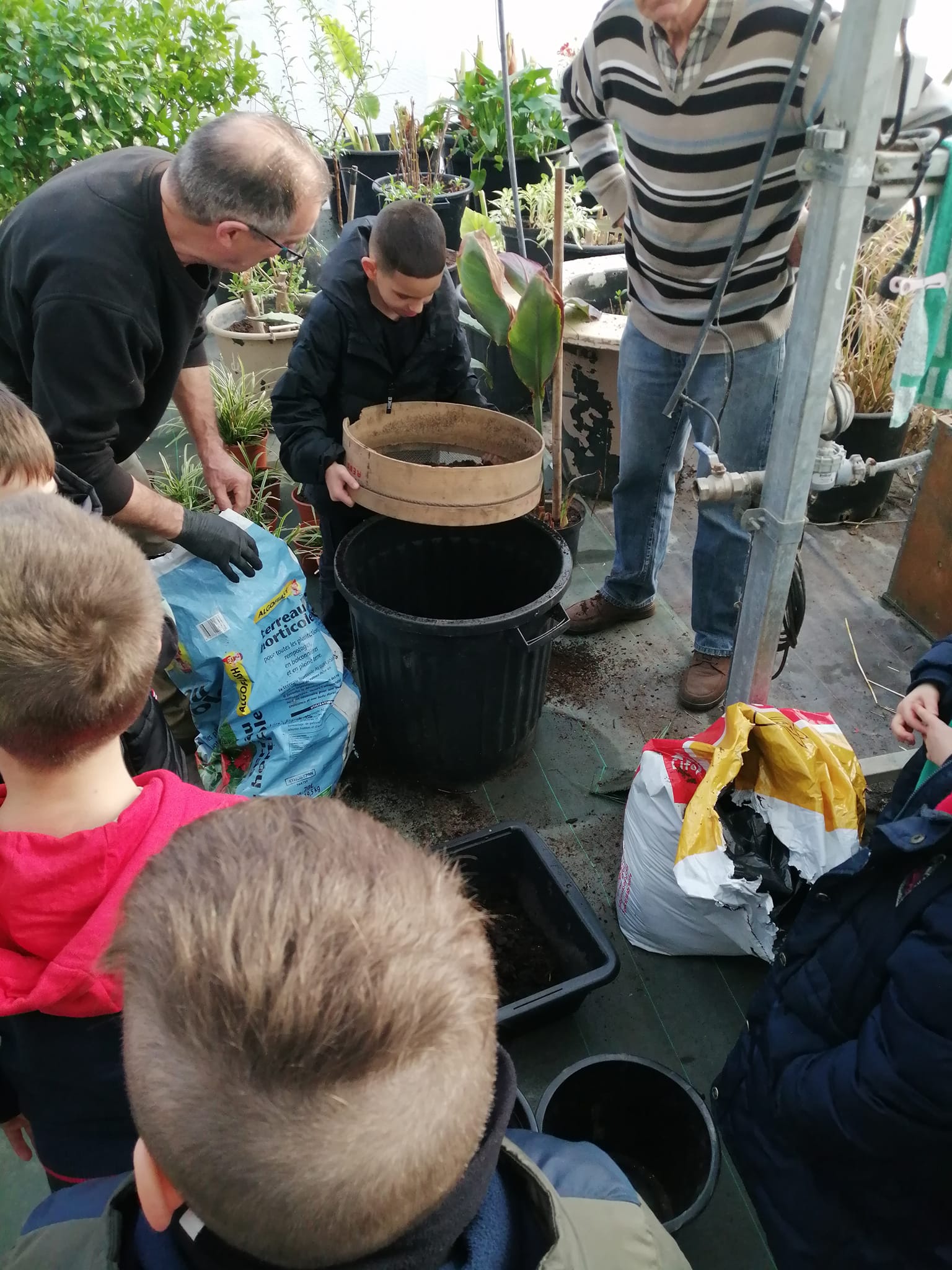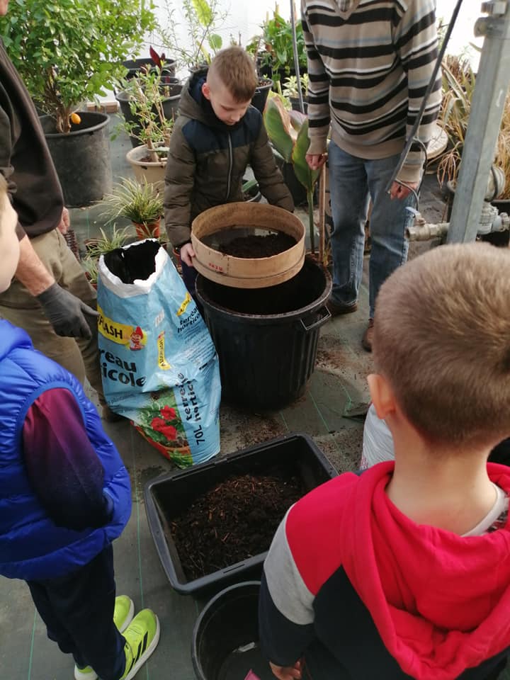 Ils ont tamisé la terre, rempli les pots, mis les graines de betteraves rouge, courgettes, butternuts puis semés des fleurs : œillets d’inde, zinnia, reine marguerite, cosmos sans oublier l’arrosage indispensable. Ils étaient tous très intéressés par les différentes étapes de cette activité concréte ….Peut-être de futurs jardiniers !