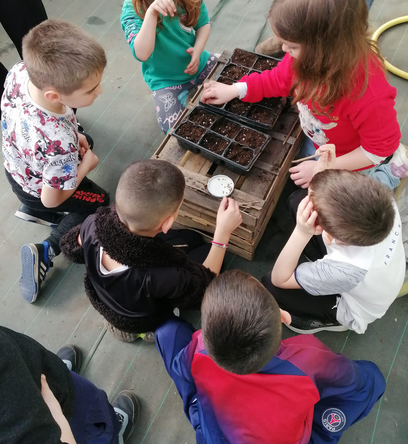 Le 20 et le 27 mars, deux groupes d’enfants du centre de loisirs ont assistés et participés aux semis accompagnés par Marilou et Guillaume de l’équipe de direction et avec les conseils éclairés des membres du CA, mais aussi d’adhérents de l’AJCP.